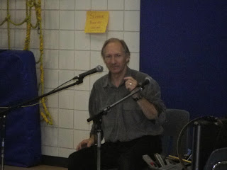 Mr. Laroche visited our school last week. He is Juno Award winner for sound effects. He invented a box with a drum and a microphone. Mr. Laroche spoke French and English to us. He made lots of interesting sounds and played the harmonica.